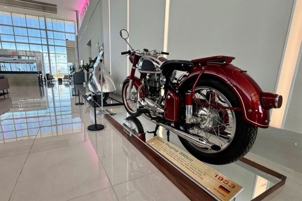 The 1953 Horex Regina 350cc OHV is a post-war German classic that quickly became the brand’s bestseller. Known for its elegant design and advanced engineering, it featured a single-cylinder engine with 20 horsepower, capable of reaching 81 mph, along with striking chrome details, alloy drum brakes, and a fully enclosed drive chain. Finished in a stunning metallic candy apple red, this beautifully restored Regina turns heads not only for its looks but also for its unforgettable exhaust tone—a true icon of 1950s motorcycling.