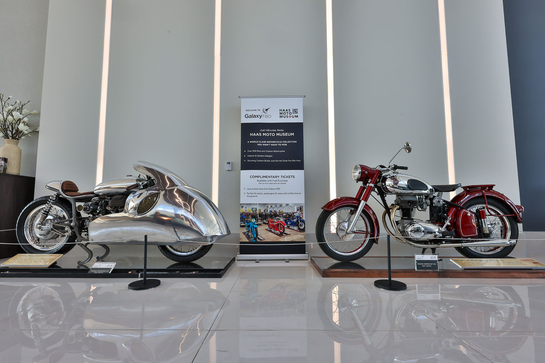 To extend the experience beyond our lobby, flight crew and travelers visiting Galaxy FBO at the Addison Airport are invited to enjoy complimentary tickets to the Haas Moto Museum. Home to more than 230 rare and custom motorcycles spanning over 13 decades, the museum celebrates craftsmanship and culture while highlighting the artistry that parallels aviation’s pioneering spirit. Whether you’re here for a quick stop, a cross-country mission, or a weekend getaway, we invite you to take a moment to enjoy the bikes on display, then continue the journey at the Haas Moto Museum. Because at Galaxy FBO, we believe every trip should be memorable—on the ground and in the air.